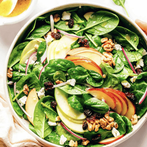 This classic apple spinach salad is easy to make with fresh ingredients, tossed with a quick apple cider vinaigrette, and easy to customize with your favorite add-ins.