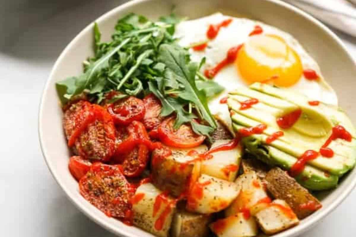 This hearty bowl features scrambled eggs, roasted veggies, crispy bacon, and avocado for a balanced, protein-packed start. It’s customizable and easy to prep ahead for the week.
