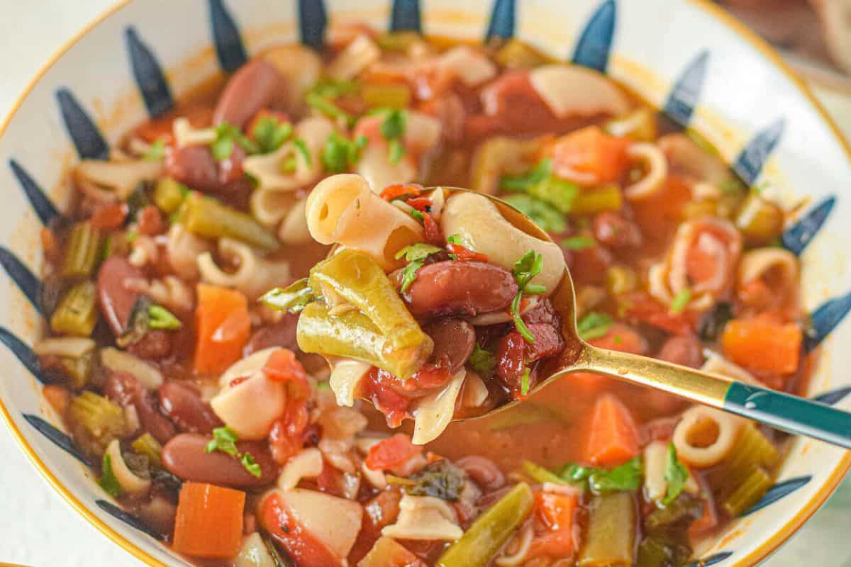 Nutritious, filling, and wholesome Italian Minestrone Soup is loaded with vegetables, pasta, and beans in a tomato-based broth. This winter Italian minestrone soup is the perfect comfort food to eat while curled in blanket on your couch watching a classic movie in the dead of winter. It is light yet warm, filling, and satisfying.