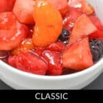 - Add Fruit: Stir in the strawberries and mixed berries. Stir in cherry pie filling, pineapple chunks, pear chunks, mandarin oranges, granny Smith apples and sliced bananas.