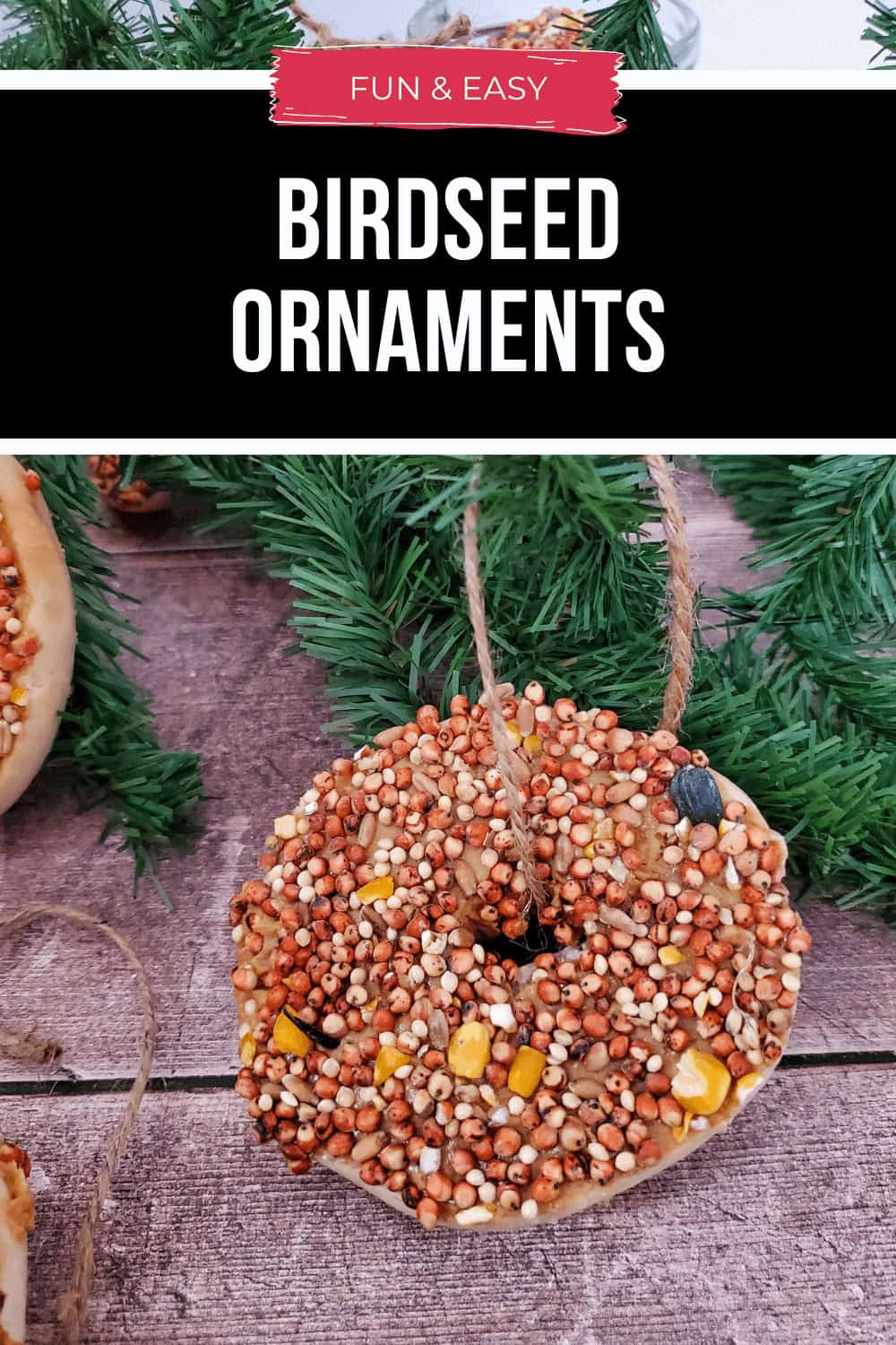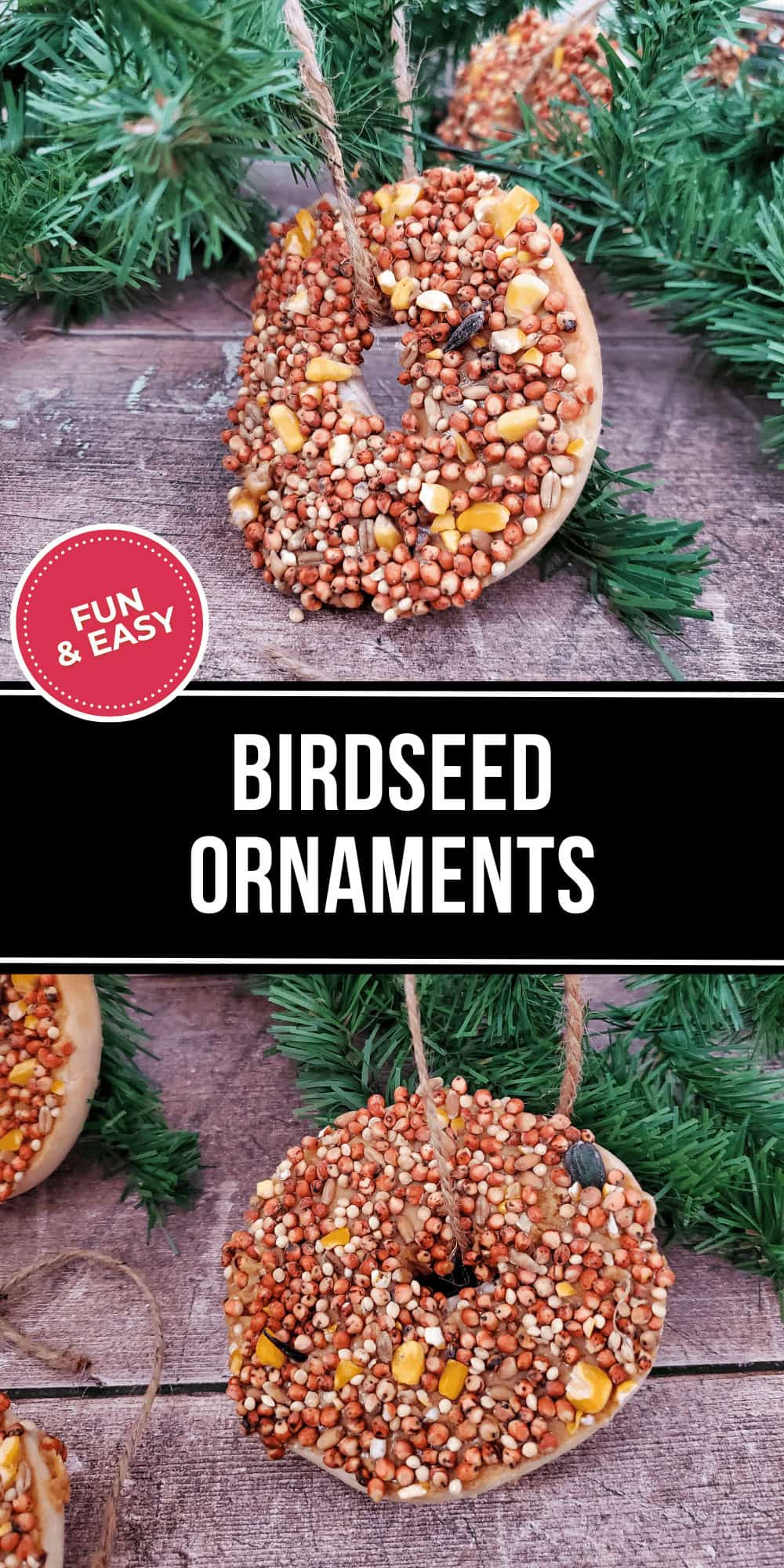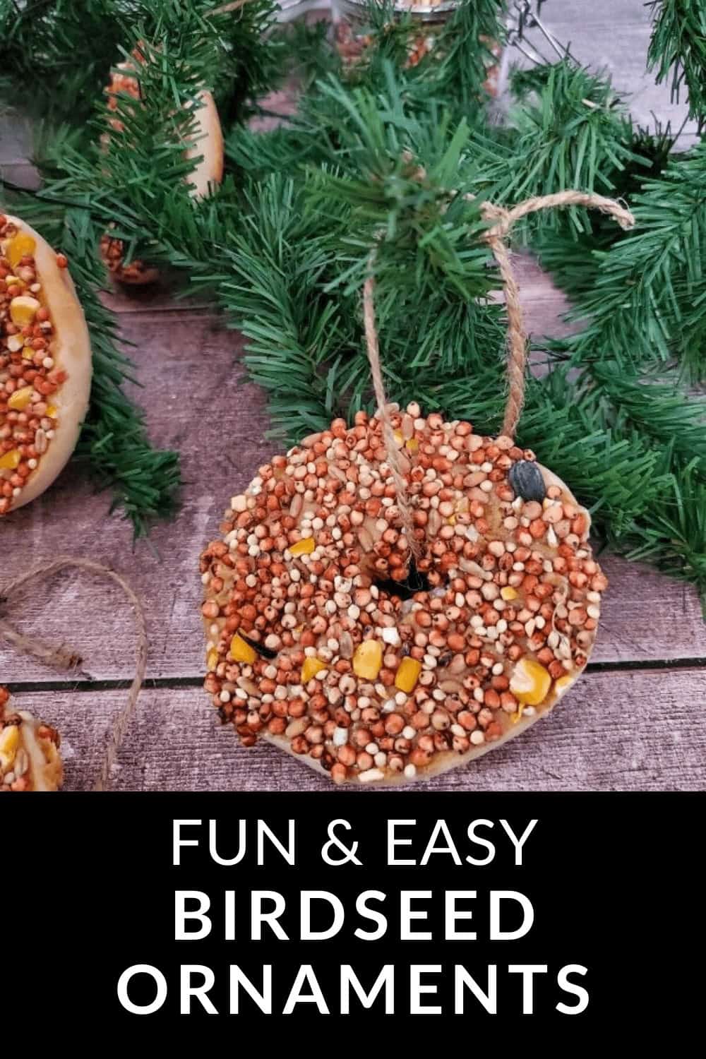 - Only 4 Ingredients: All you need to make birdseed ornaments is mini bagels, birdseed, peanut butter, and twine. All of the ingredients are edile and healthy for birds.