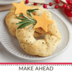 Allow the wreaths to cool completely, then place a fresh rosemary springs on top of each. Cut stars out of the cheese with a cookie cutter and decorate the wreaths. Place the wreaths on serving platter and serve.