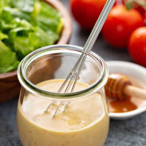 A mason jar of the White Balsamic vinaigrette.